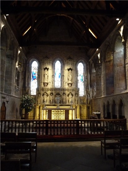 The chancel of St Aidan's churchk, with reredos by W.S. Hicks, featuring local saints