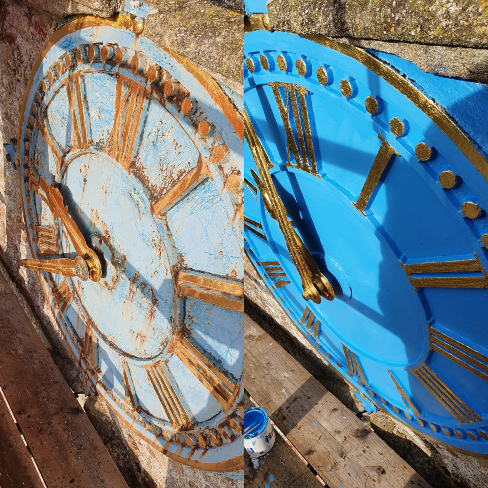 Photograph of clock face before and after work