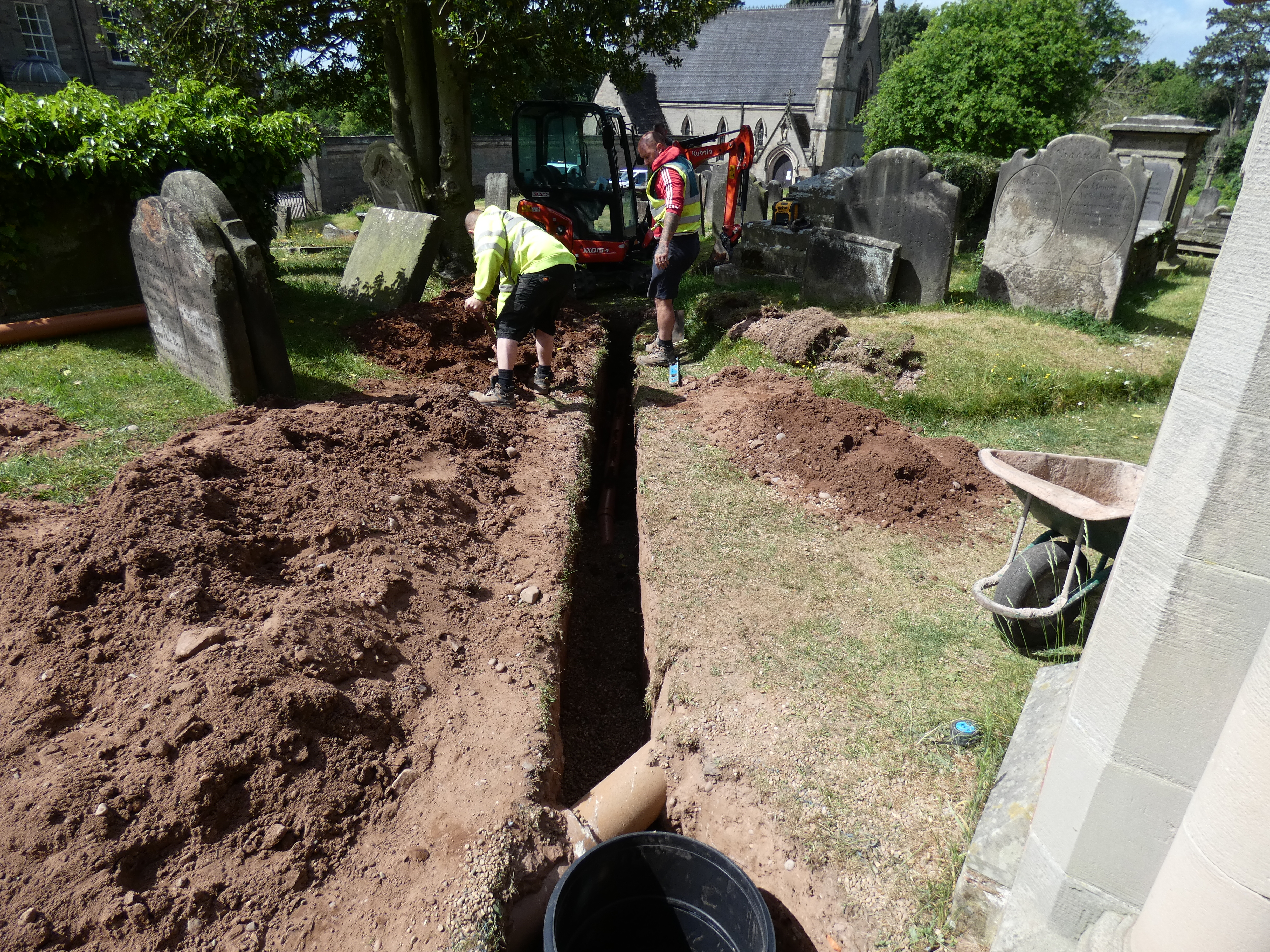 Picture of manhole outside of South Porch and top section of sewer pipe showing installed depth and existing roof drain pipe installed in the 19th Century