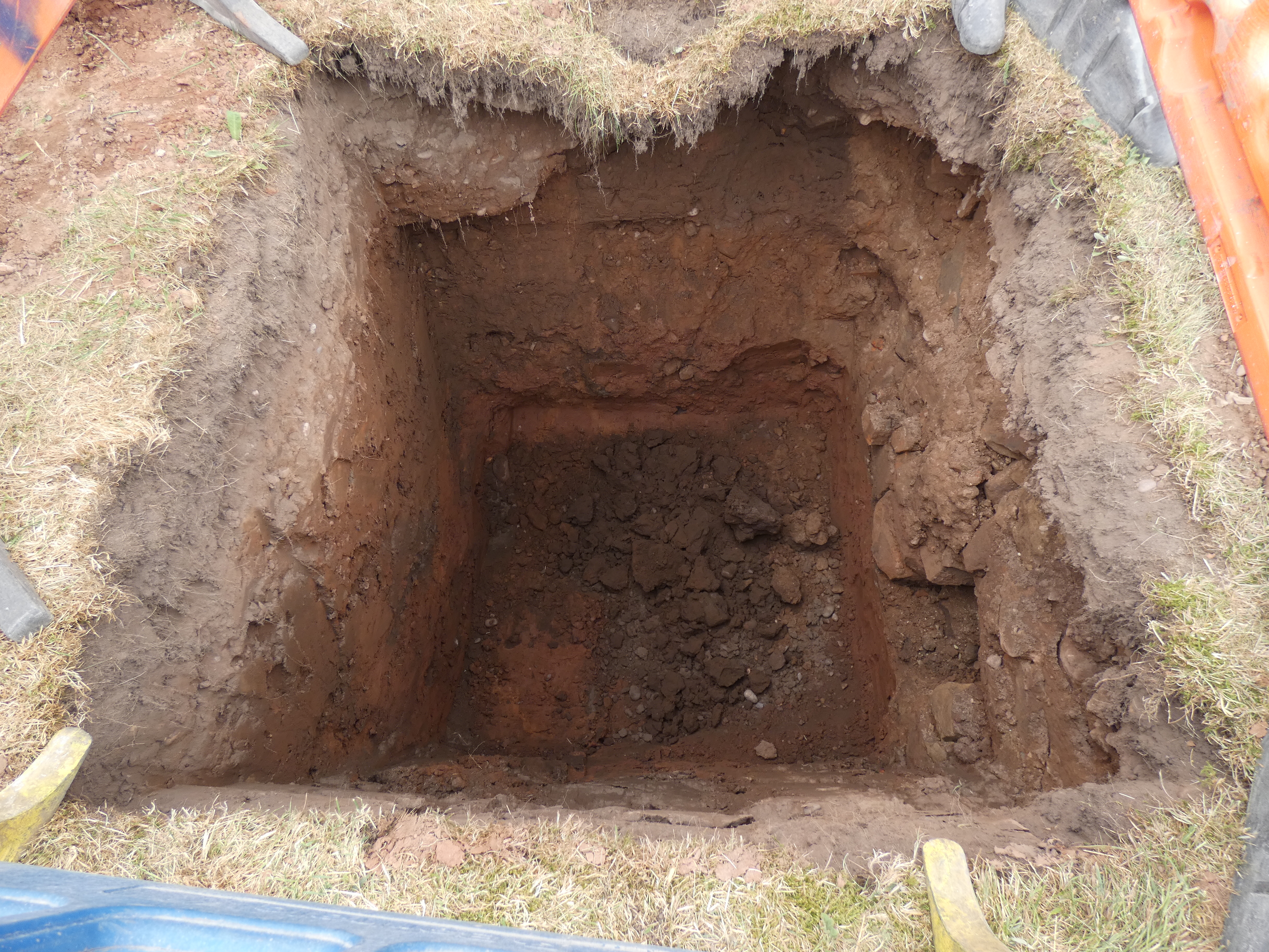 Manhole excavation after removal of skeletal remains and showing the wall foundations that the sewer pipe has to go under.