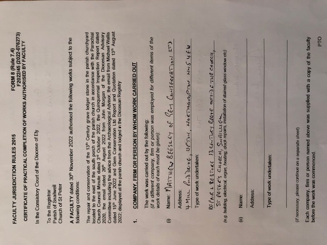 CERTIFICATE OF PRACTICAL COMPLETION OF WORK CARRIED OUT IN THE REPAIR AND RESTORATION OF A 13CENTURY GRAVE AT ST PETER'S CHURCH IN SNAILWELL