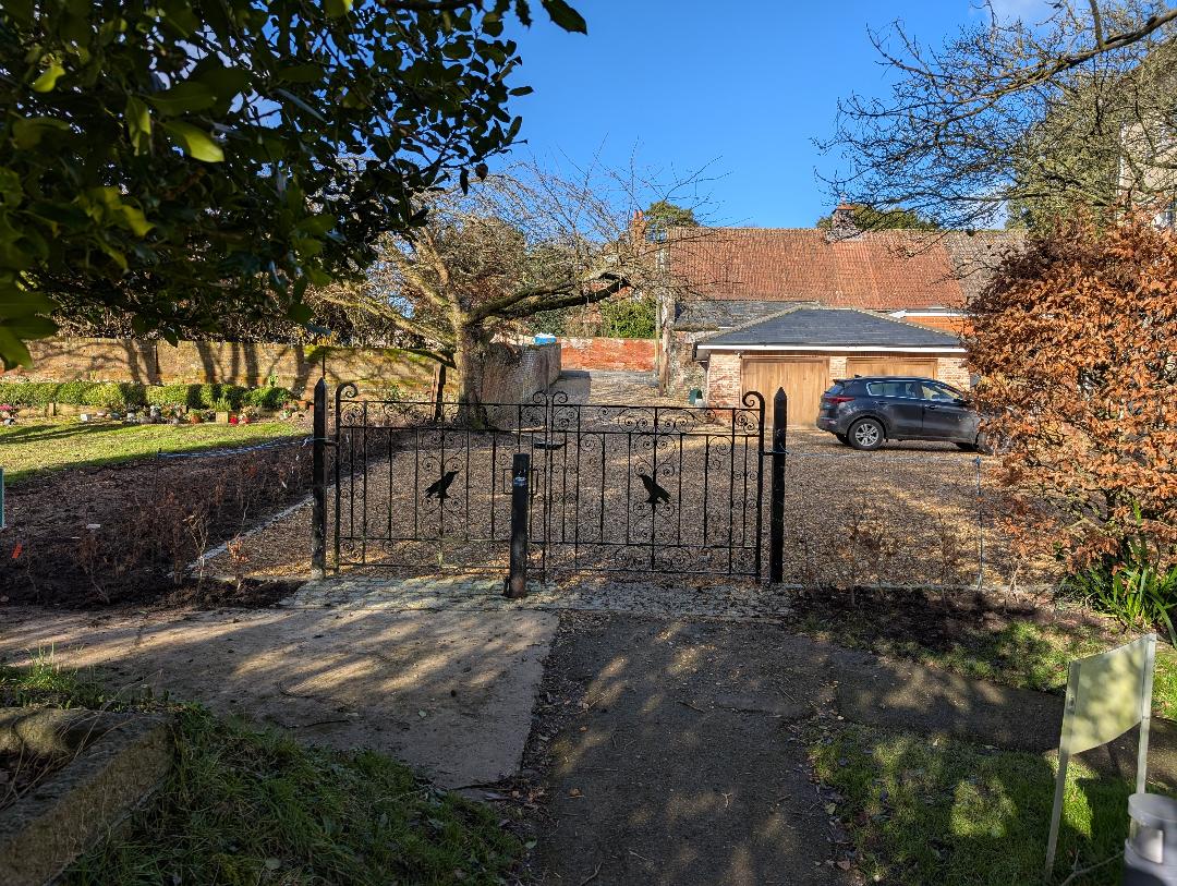 Photo of view through the North Gate Holy Cross Ramsbury, towards the north showing new positioning, setts and hedging