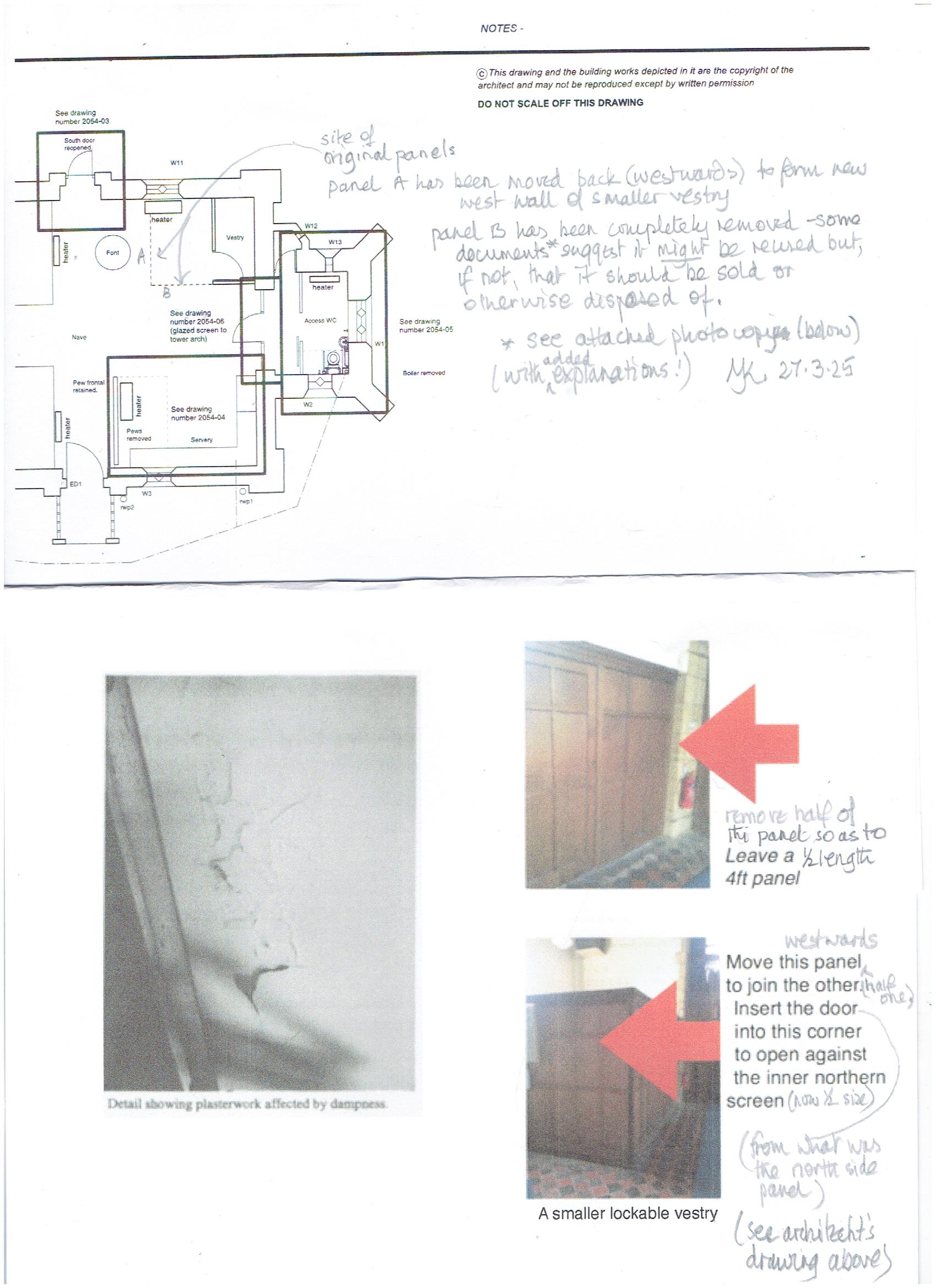 Mary Kenchington's photocopy of page from documentation accumulated by Sandy Marchant during the (2018ff) preparation for this faculty - purpose to show that reducing the size of the Vestry would mean that the removed half panel would then be surplus to requirments and need to be removed from the church. Other paragraphs from various bits of correspondence supporting this conclusion can be produced if required