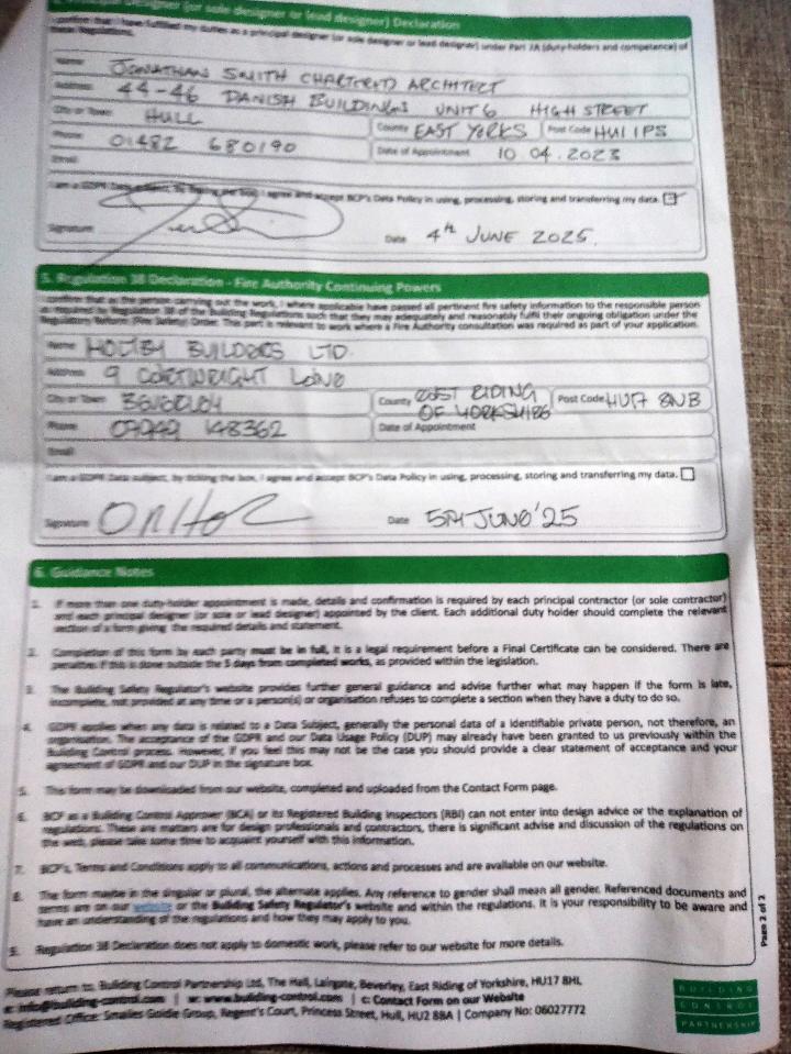 Notice of Completion after Building inspectors visit by East Ridings subcontractor - Building Control Partnership Ltd