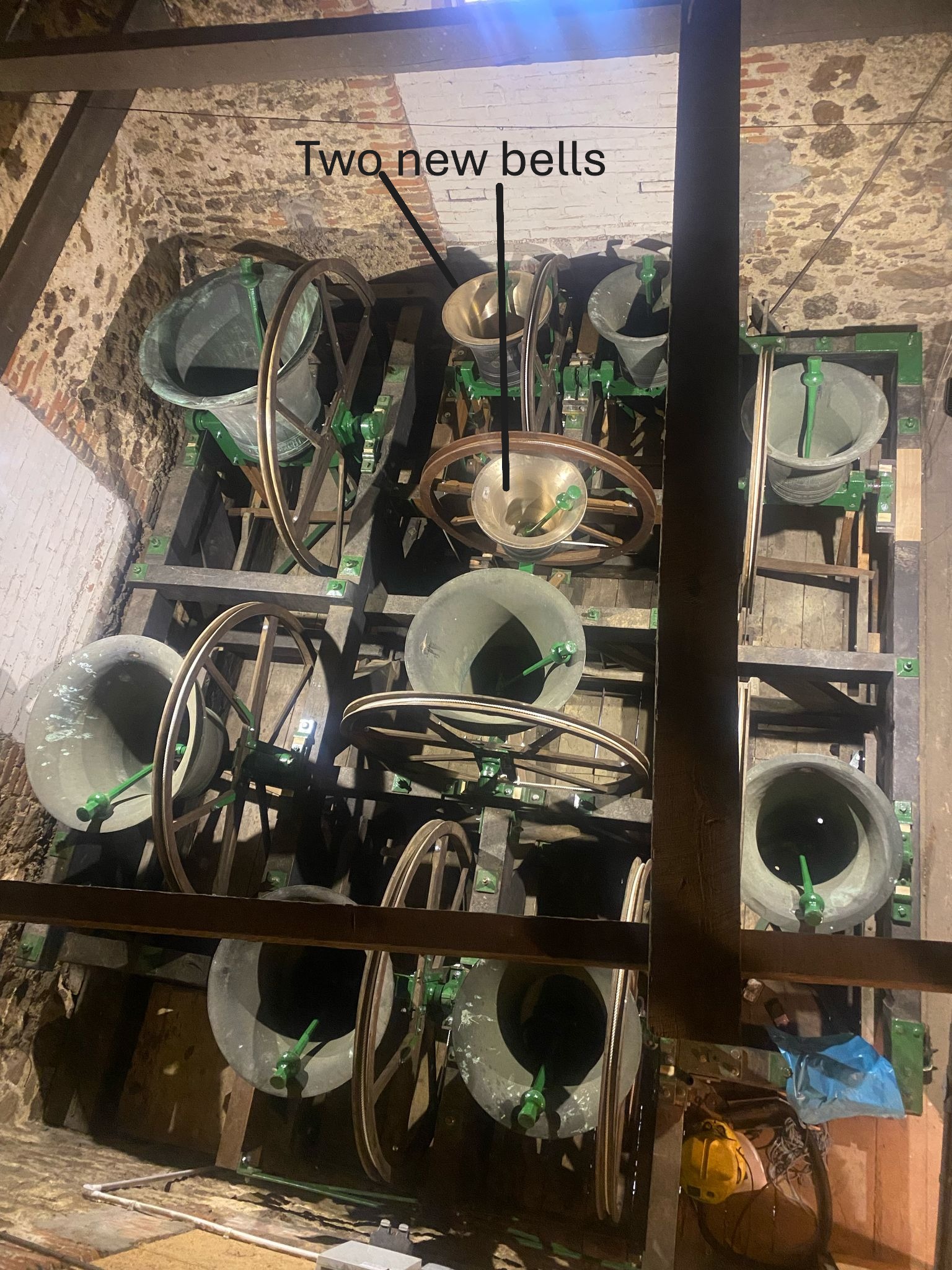 View from above of the new two extra bells in the modified frame of 1892, New bells marked