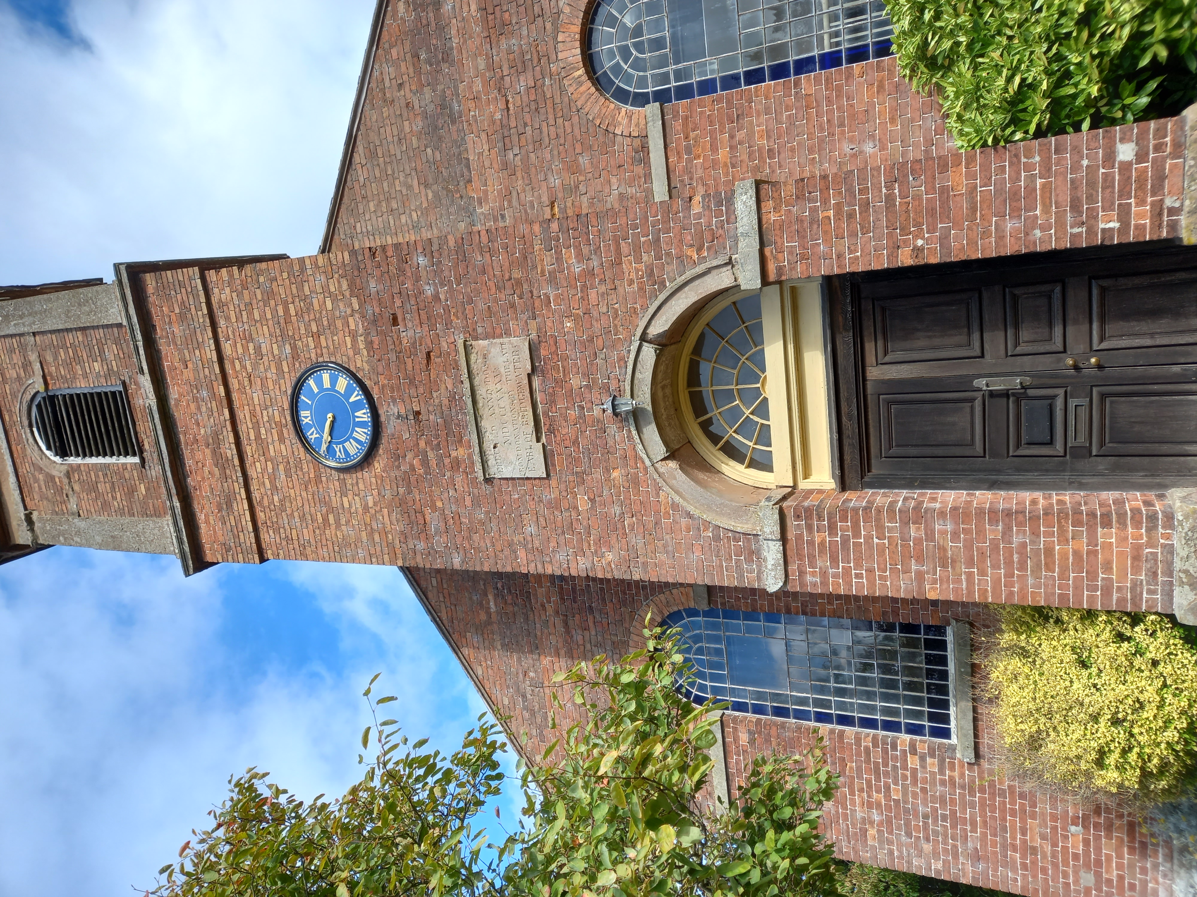 A ground level photograph looking up at the restored clockface of Christ Church Tilstock
