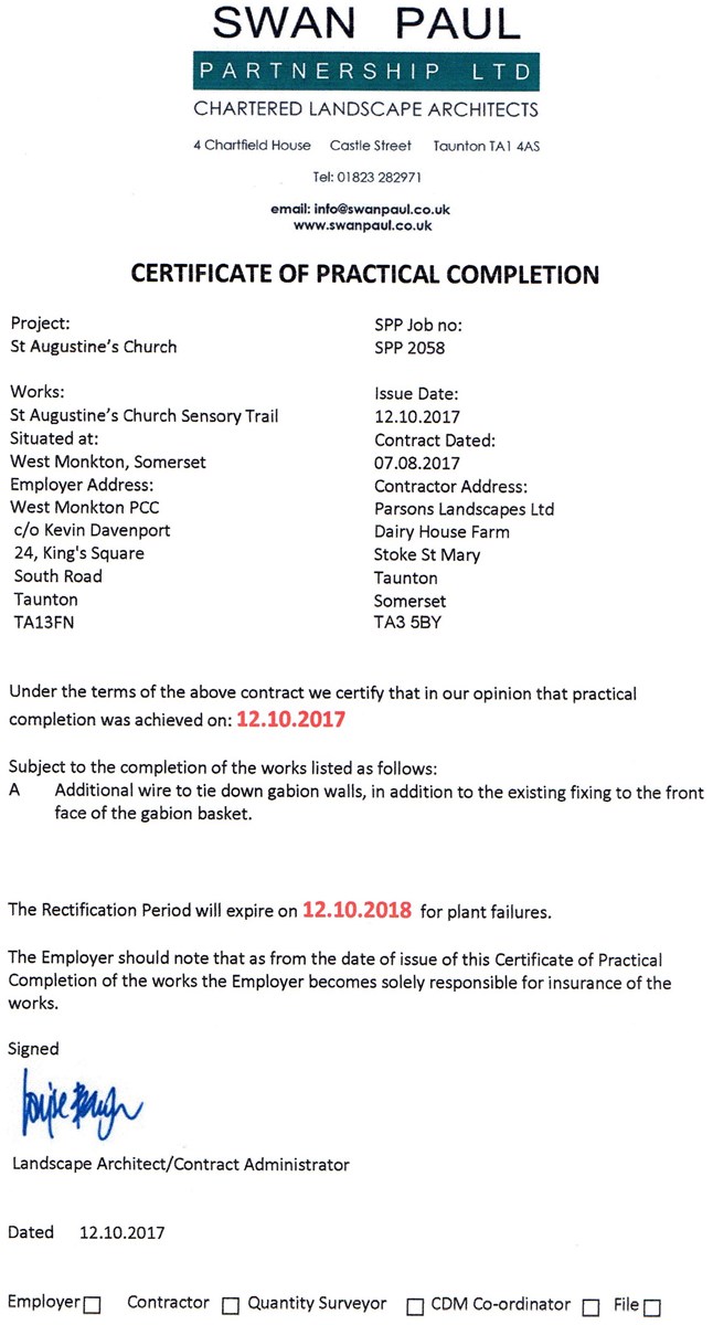Completion of Sensory Garden/Trail areas dated 12 October 2017.
