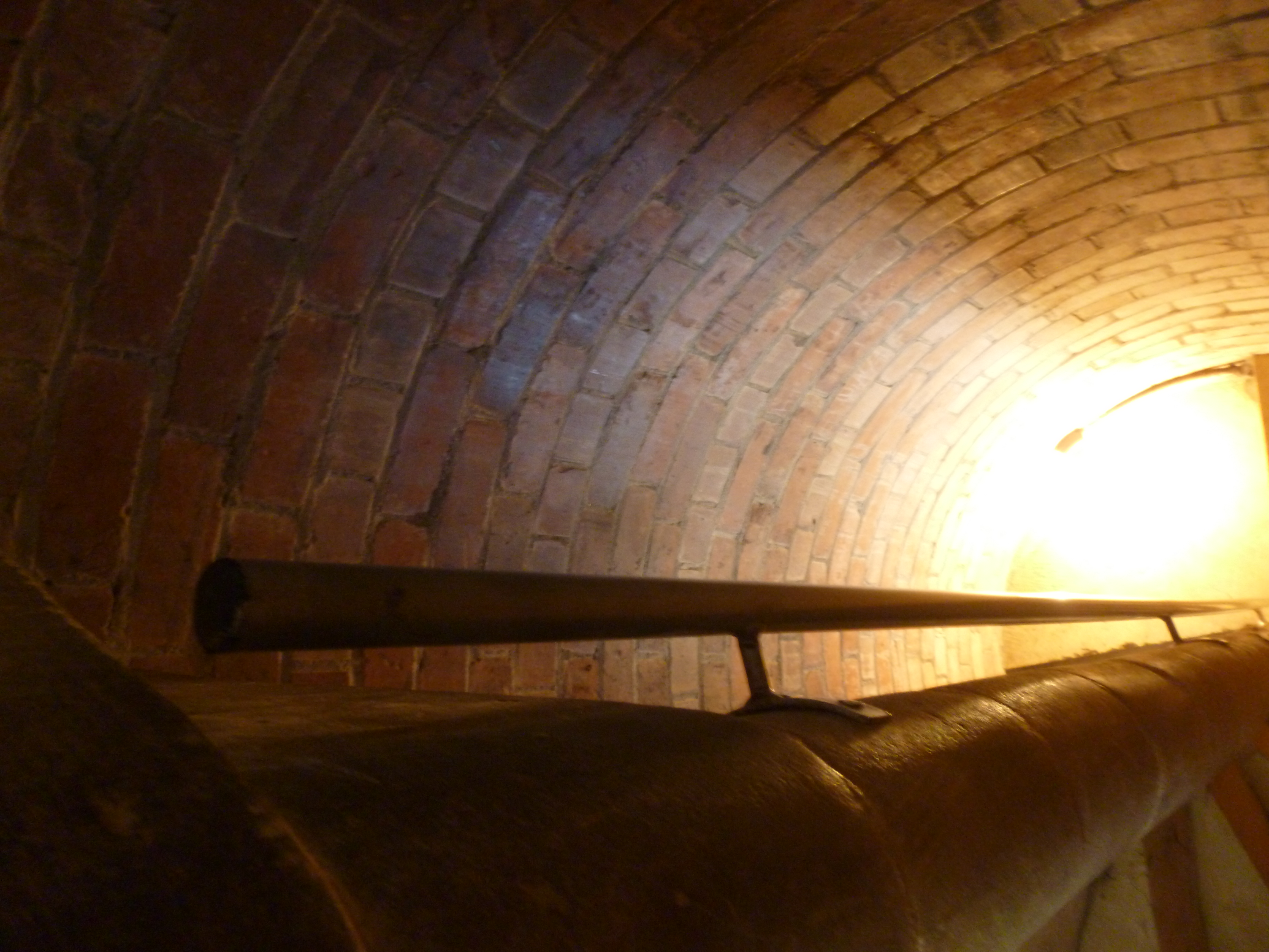 Photograph of one handrail taken from below (looking up). The two points of attachment are clearly visible.