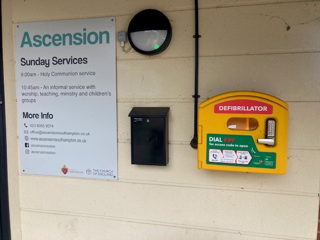 Photo of installed defibrillator by Thorold Road entrance to Ascension